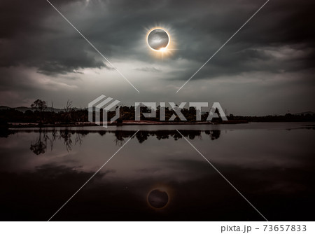 Scientific natural phenomenon. Total solar eclipse with diamond ring effect glowing on sky.