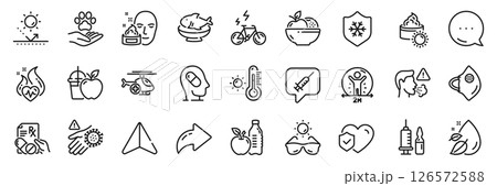 Cardio training, Life insurance and Medical vaccination line icons pack. Share, Message, Paper plane icons. Weather thermometer, Vaccine message, Depression treatment web icon. Vector