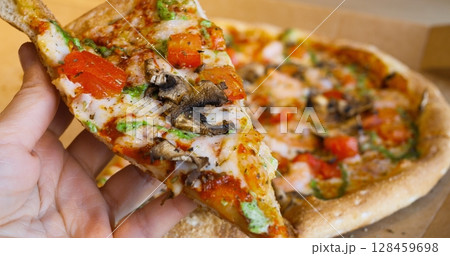 Hand hovering over whole pizza in cardboard box, lifting slice showcasing melted cheese, ripe tomatoes, sliced mushrooms, and sprinkled herbs in gourmet close up