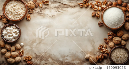 Scattered nuts, semolina, sugar forming culinary frame on rustic surface eid baking preparation copy space Uraza Bayram