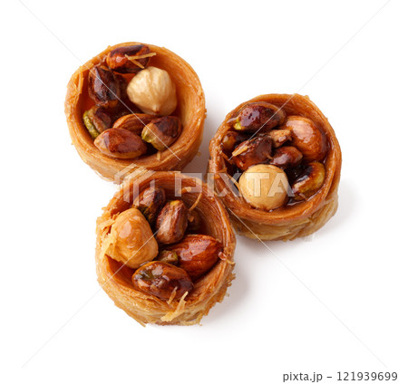 Delicious pastry filled with mixed nuts and honey syrup showcases a traditional dessert from the Middle East