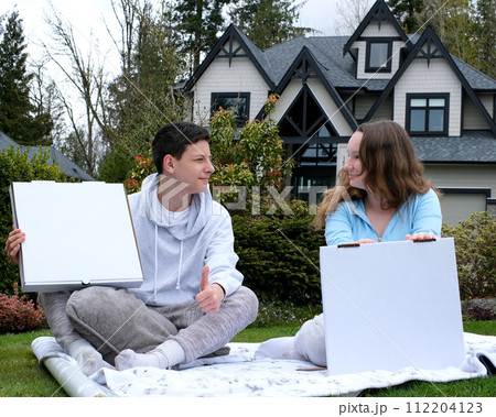 teenagers boy and girl sitting on a picnic with white boxes empty space for advertising text pizza cake on a plaid sportswear thumb up look at each other love for food joy approval tasty picnic