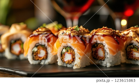 Sushi rolls on black plate