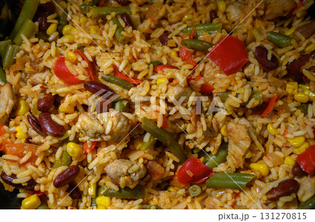 Savoring vibrant rice medley with vegetables and tender chicken in a cozy kitchen setting