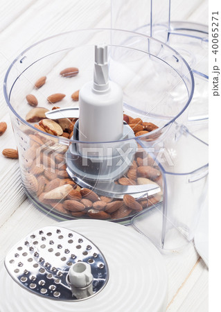 Chopping nuts with a kitchen appliance on a wooden table at home