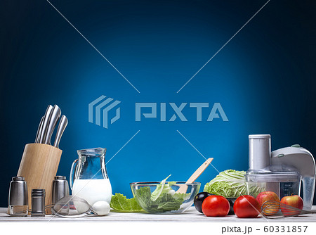 Vegetables, ingredients and kitchenware on a blue background