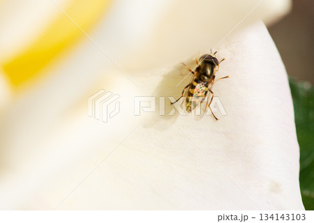 一隻小食蚜蠅,“窄翅蠅”,停在白色的奧爾良花瓣上…2
