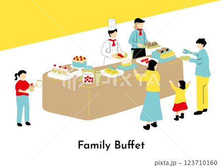 Hotel buffet. Smorgasbord in restaurant, people at dining table catering all inclusive service breakfast food wedding party business banquet cafe event, classy vector illustration
