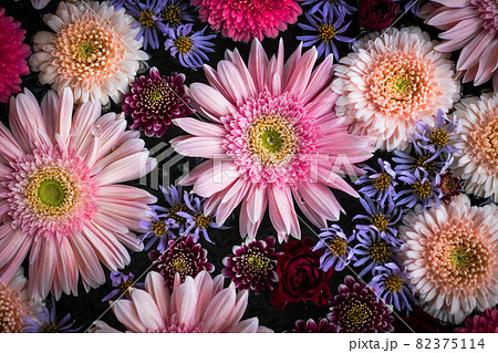粉色和紫色花朵背景(非洲菊、紫菀、菊花)