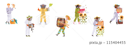 Equipped Beekeeper or Apiarist Gathering Sweet Honey from Beehive Vector Set