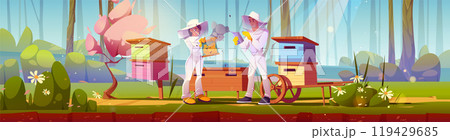 Beekeeper with beehive boxes. Bee farm. Cartoon forest landscape. Summer garden. Sunny field. Apiary keeper. Apiarists in uniform. Wild nature. Woman and man collecting honey. tree. Vector background