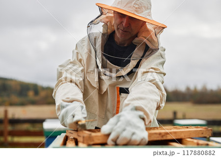 Cropped shot of middle aged male beekeeper in protective bee suit against grey autumn sky working with hive frame during honey harvesting at apiary farm, copy space