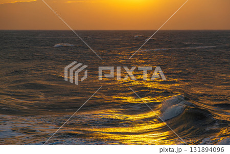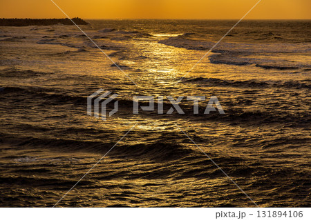 桐鄉海岸線,夕陽將海面染成金黃色