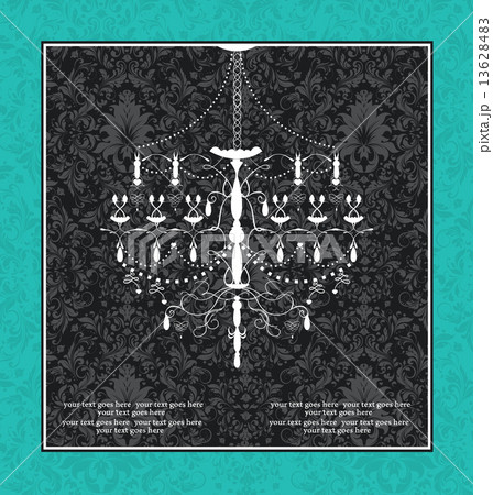 Vintage invitation card with ornate design and chandelier