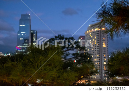 Pine tree branch with blurred background of high-rise buildings at night, in Seoul