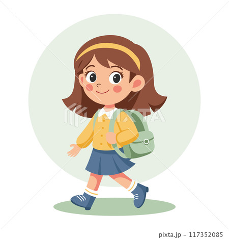 Cute schoolgirl with school backpack going to school. Pupil character. Flat style illustration