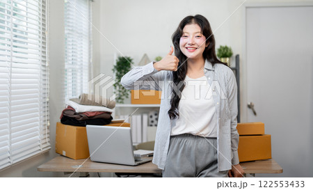 Asian woman use of notebook computer and thumb up