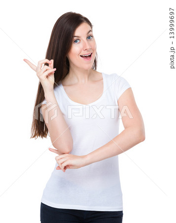 Businesswoman with folder and finger point up
