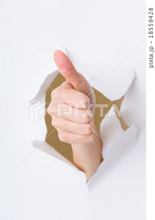 Hand break through paper with thumb up gesture
