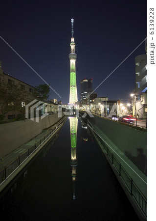 與被點燃的東京天空樹的顛倒的樹香賓樹在河表面反射了