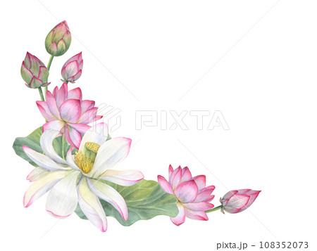 Floral composition of Indian sacred lotus flowers with leaves. Water lily, Indian lotus, green leaf, bud. Space for text. Watercolor illustration for greetings, package, label.