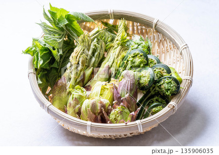 在竹漏勺的春天野菜。水彩風格的插圖。