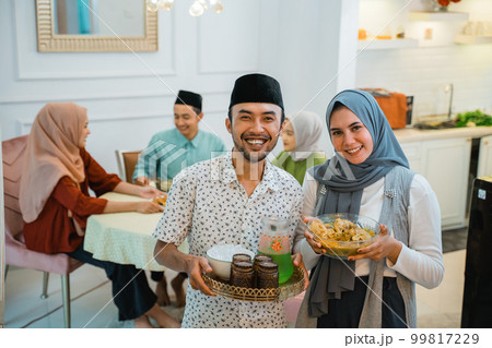 asian couple serving food for friend for break fasting