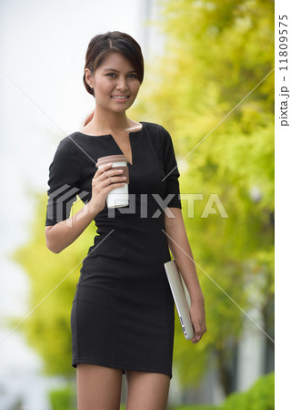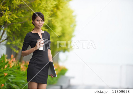 Successful young Malay business woman with along promenade during coffee break time