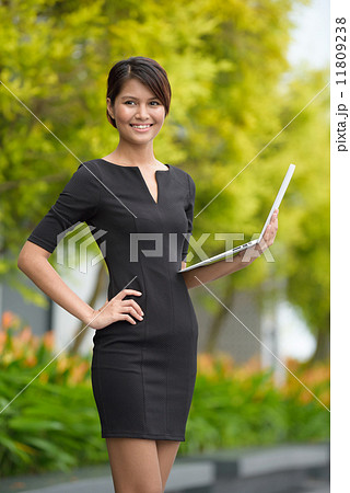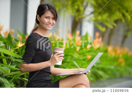 Successful young Malay business woman with coffee cup and laptop along promenade during break time