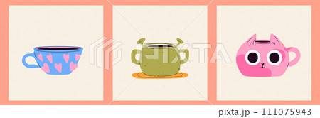 A set of IG post card with ceramic mugs and a groovy style. With different textures and patterns and prints. Organic funny shapes. Vector contemporary illustration