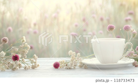 White porcelain mug with saucer on a wooden table against the background of a field. Copy space