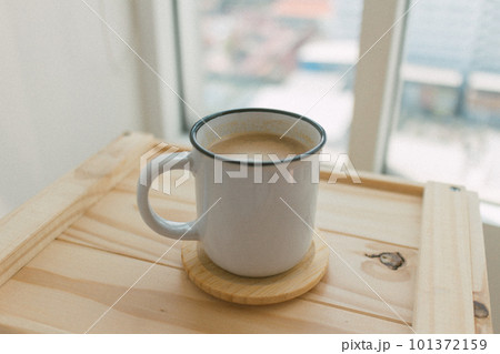 Coffee cup on a wooden crate in the morning.