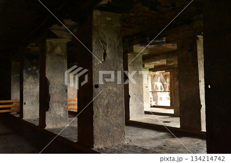 One of the Cave 12 Vihara Hall Interior and Cell Doors with rock-cut, Bhaja Caves, Ancient Buddhist built in 2nd century BC, during the Hinayana phase of Buddhism, Lonavala, Maharashtra, India.