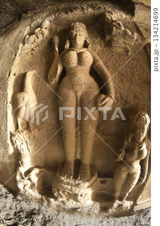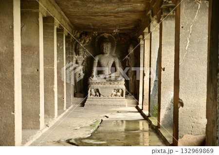 Buddha statue carved from stone at the Ellora Caves. Ellora, a UNESCO World Heritage Site, is one of the world's largest collections of rock-cut temples and shrines.