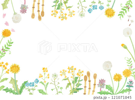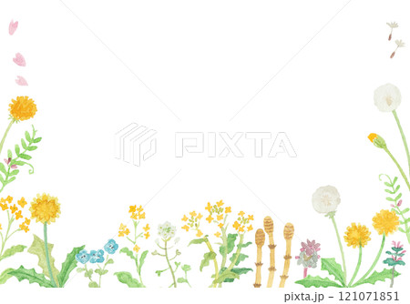 春天田野裡盛開的蒲公英、櫻花和馬尾的可愛框架