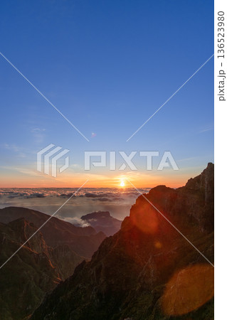 Sunrise over cloud sea at Pico do Arieiro, Madeira, bright sun flare lights steep ridges, vertical