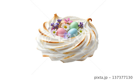 Delicate, crispy meringue nest shaped for easter, filled with tiny pastel candy eggs and adorned with edible spring flowers