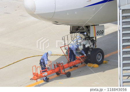 用於設定牽引桿的地勤 羽田機場的編組 地勤