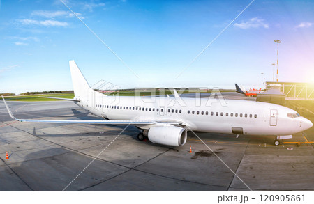A white passenger aircraft at the boarding bridge in the rays of the evening sun