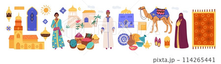 Oriental scenes. Ramadan arch windows. Arabic architectural elements with city landscapes. Sun at sky. Muslim culture and traditions items. Desert camel. Arabian bazaar. Garish vector set