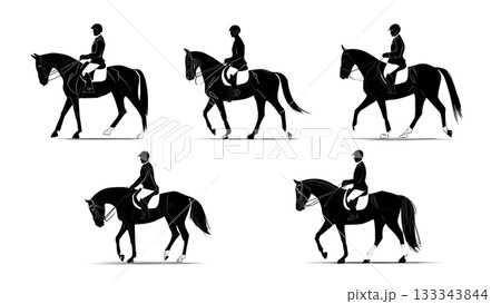 Black Solid Adjusting Saddle Position Horse Riding Silhouettes Set of Six on White Background