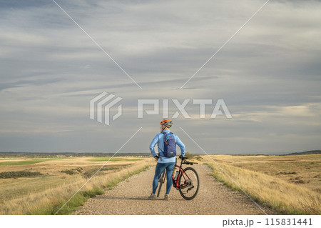 male cyclist with a gravel bike on a ranch road in Colorado foothills in spring scenery