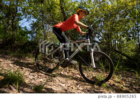 Woman cyclist enjoy the beautiful sunrise on summer forest trail