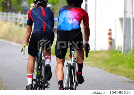 Wellness and sport activity in autumn, Two cyclists riding along an autumn forest road, back view