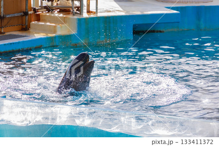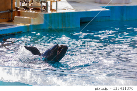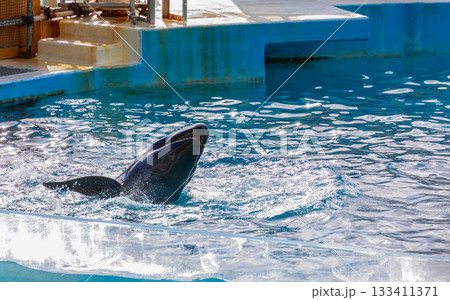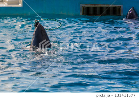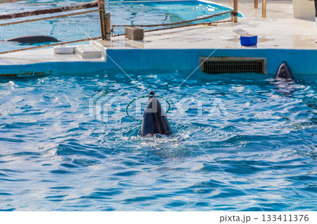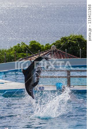 沖繩海洋公園中海豚躍出水面進行高難度特技表演