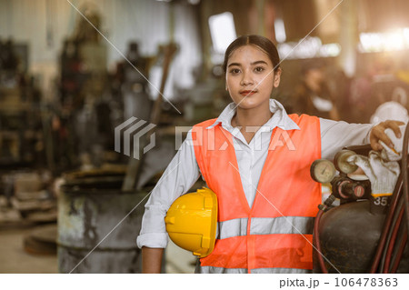 portrait happy young asian woman worker with heavy metal machine lathe milling factory industry