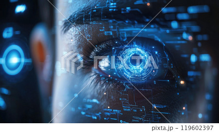 Facial recognition technology, human eye with digital data, face close-up. Concept of identification, person, id, AI, biometric system