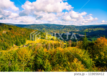 A breathtaking autumn vista unfolds from Spicka lookout tower, showcasing the golden hues of fall foliage and the lush landscape of Tanvald in the Jizera Mountains of Czechia.