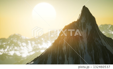 A stunning mountain peak towers against a vibrant sunset, casting shadows across the rugged landscape. The warm sunlight enhances the snow capped summit, creating a breathtaking view.
