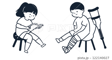 一個簡單可愛的插圖,一個腿斷了的男孩打著石膏,一個女孩坐在椅子上讀書